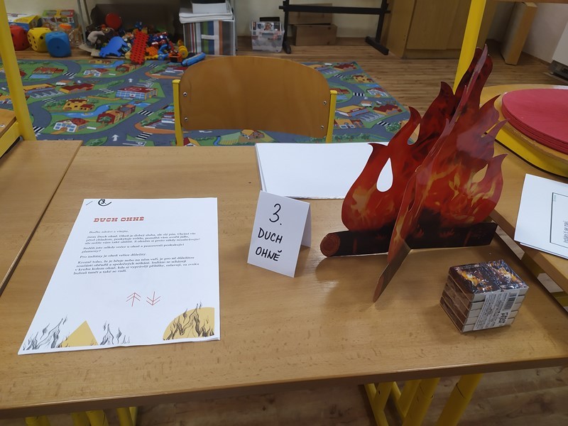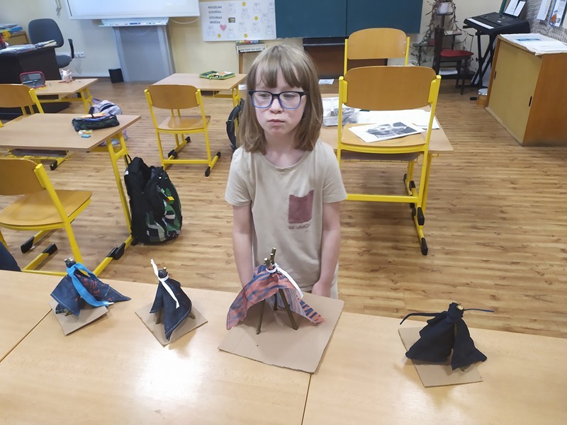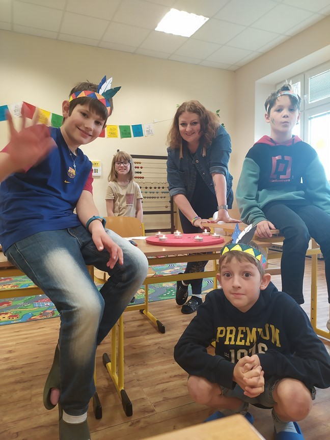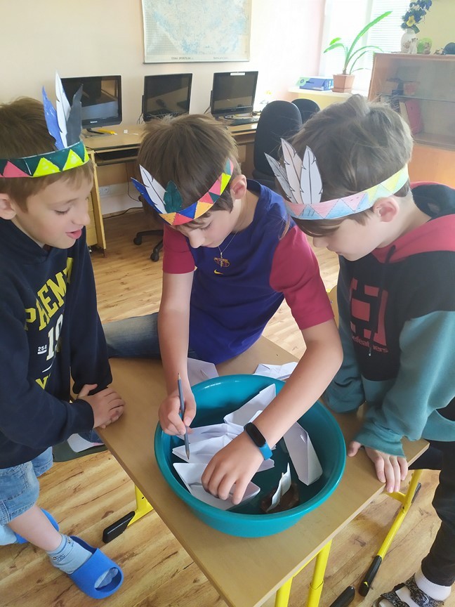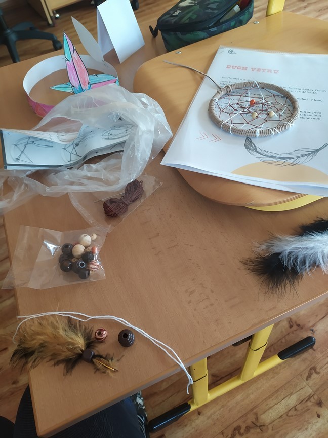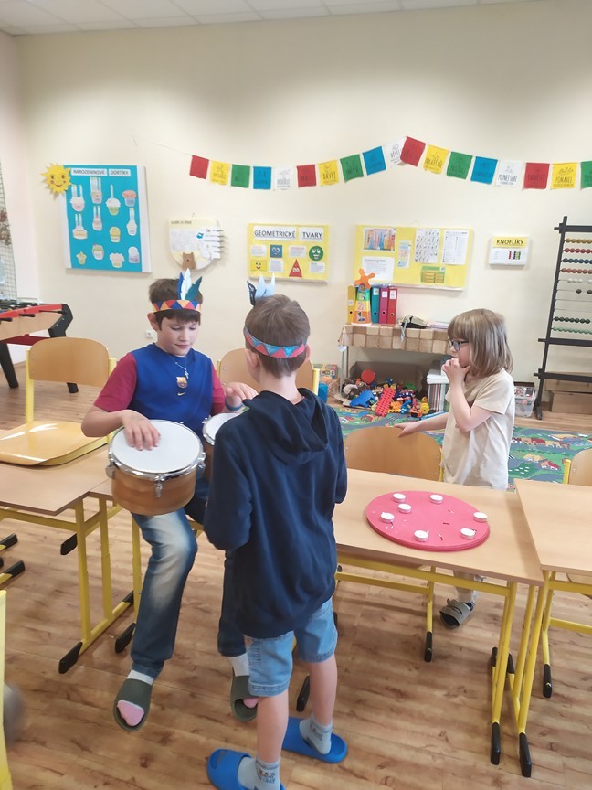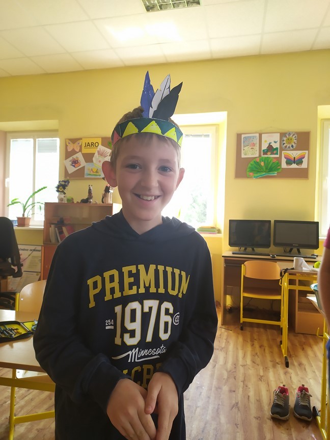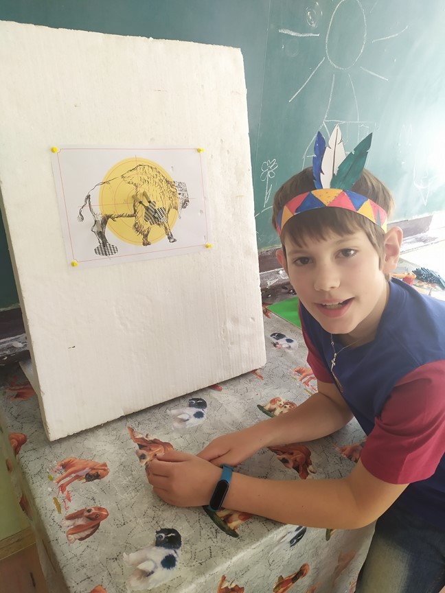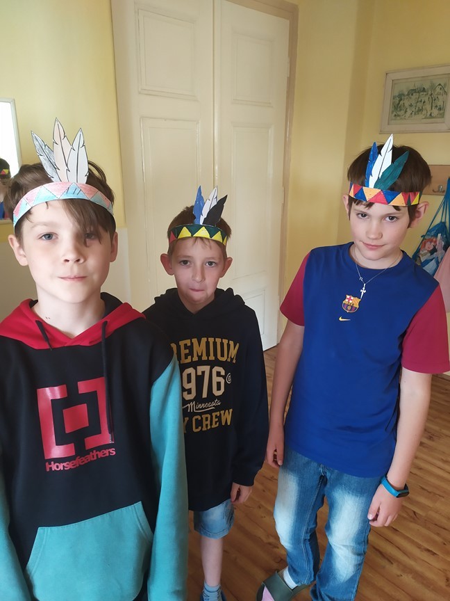 Indiánská bojovka, 6.6.2024 Děti splnily úkoly na indiánské stezce – výroba čelenky, lodičky, lapače zlých snů a týpí. Ulovily bizona a u indiánského ohně si zahrály na buben.